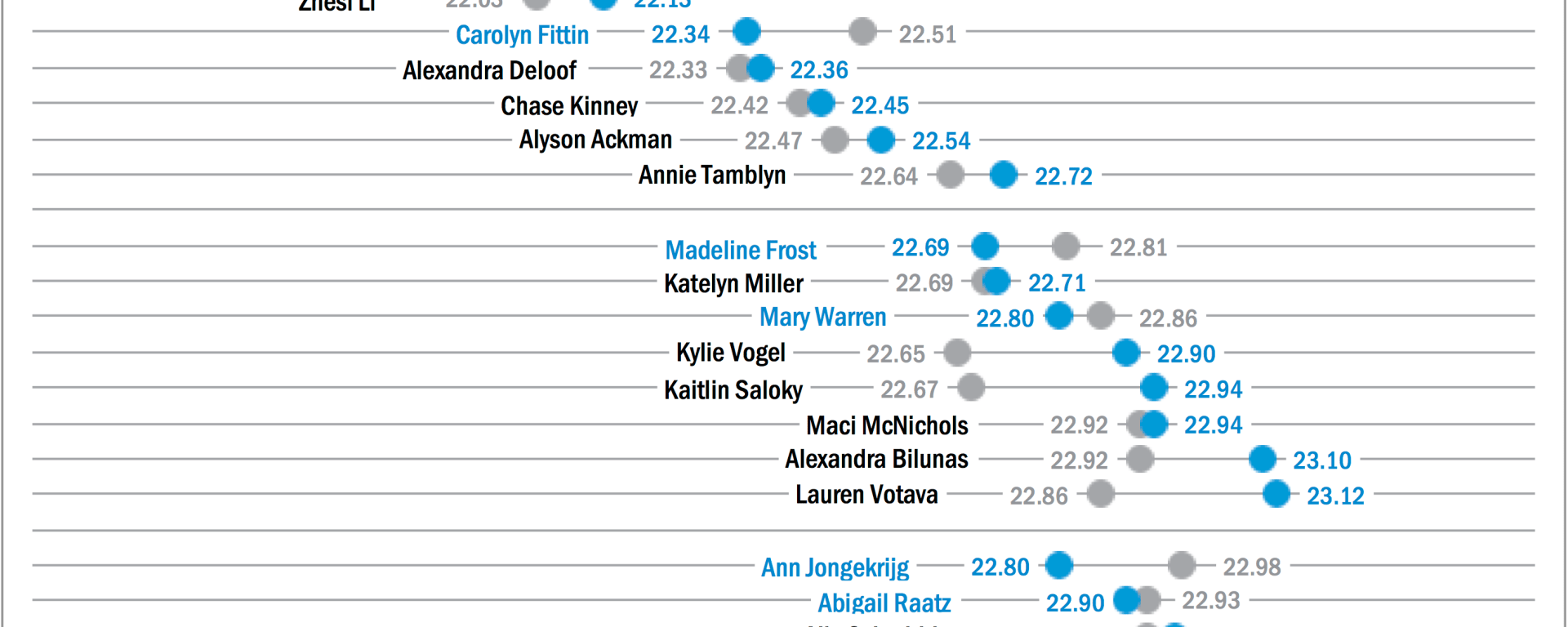 The graph shows the top 16 women’s 50 freestyle swimmers, with the morning prelims time displayed in grey, and the night-time finals time displayed in blue. To speculate on what accounts for the night-time slow-down, perhaps 50-freestylers are fresher in the morning swim and get their best swim then. Or perhaps it owes to the short duration of the event, and that the 50 is not as taxing on the body as other longer events. Perhaps most swimmers just go all-out and hold nothing back in the morning prelims swim. Although coaches, parents, and fans love to speculate on why this might be happening, I’m interested to see if this relationship between morning and night swims holds up throughout the course of the meet.